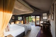 The camp is intimate and private, with five tents and two family units with adjoining bedrooms and en-suite bathrooms. The spacious Meru-style tents are built on raised decks with luxurious interiors; en-suite bathrooms complement the outdoor shower "with a view." A dining area, lounge and pool with glorious views over the surrounding floodplains and a small lediba (remnant lagoon that has become a waterhole), after which the camp is named. Game comes to drink from this water source often during the day.