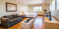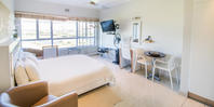 Open plan studio with balcony. King/Twin beds with kitchenette and shower.