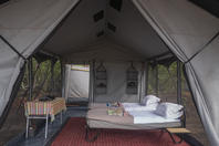Meru tents with clear mesh that fully opens up to the surrounding bush, providing an immersive nature experience. Egyptian Cotton linen and very comfortable bedrolls are laid out on sturdy camp beds.