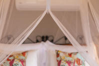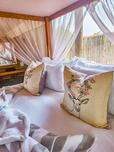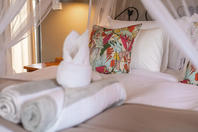 Suite facilities include a tea/coffee station, standing fan, air con, hand luggage stand, hair dryer, mosquito net, safe, bathroom amenities, changeable twin / double bed configurations and a private seating area on a raised wooden deck.