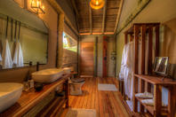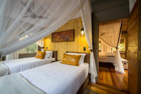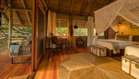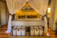 Seven safari tents on raised wooden platforms accommodate guests in simple yet gracious elegance. All feature either double or twin beds and en-suite bathrooms with indoor and outdoor showers. Being a child-friendly lodge, the family tent consists of two bedrooms sharing an en-suite bathroom. The main lodge areas comprising seating and dining areas, bar and swimming pool, are also perched on raised platforms ensuring superb views of the waterhole.