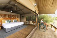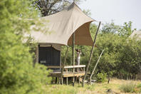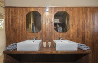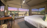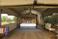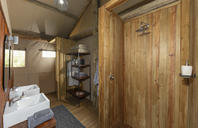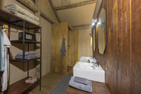 Spacious tent with either twin or double bed under mosquito net with overhead fan and bedside lighting and charging points on either side of the bed. A desk and arm chair provide extra seating and a luggage rack allows luggage to be easily accessed whilst kept out the way. An ensuite bathroom behind the bed includes a toilet cubicle, double vanity with mirrors and overhead lighting, wardrobe space with safe and shower.