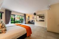 The guesthouse features two room types: Standard and Deluxe. Standard Rooms are situated upstairs with garden views, and include a Super King or twin beds, air conditioning, mosquito nets, and a private balcony. Deluxe Rooms are larger, located downstairs, and offer similar amenities with the addition of a sleeper couch or cot for families.