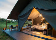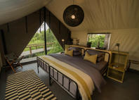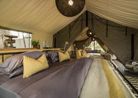 An open sided tent houses the lounge and dining area - classic and comfortable - welcoming all guests. Dinner can be enjoyed under the stars or more intimately under canvas. Inviting white sand leads from the main tent to the campfire and to the meandering river beyond.