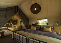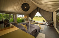 Accommodation consists of ten spacious safari tents, two of which are family units. The tents are on decking with a private verandah looking toward the seasonally flowing Gomoti River. Bathrooms are en-suite, complete with inside and outside showers, double vanity basin and flush toilets. Limited electricity is available in the tents, allowing for lighting and camera charging.