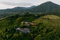 Bisate Lodge is located in the natural amphitheatre of an eroded volcanic cone and has dramatic views of the peaks of the volcanoes Bisoke and Karisimbi rearing up through the Afro-alpine forests of nearby Volcanoes National Park.