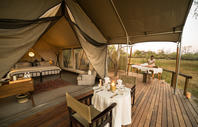 The main dining and bar area overlook a large flood plain, with a swimming pool in front of camp. Spa treatments can be booked additionally.