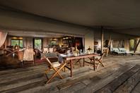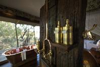 Zarafa’s four guest tents, 1000 sq. ft in extent, are under beige, flowing canvas, with canopy ceilings and completely open (yet netted) sides. Entering through the heavy wood Lamu door transports guests to a lavish space of deep reds, browns, brass and copper, evoking richness and beauty. Each tent has a full lounge with desk and gas fireplace for winter. The large bedroom is connected to an open layout bathroom with impressive copper claw foot bath, indoor shower, separate loo and double basins.