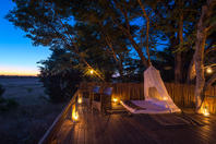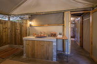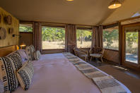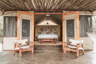Accommodation consists of 6 walk-in tents with twin beds, one of which is a family tent with two adjoining sleeping rooms sharing a bathroom. Each room has an en-suite shower, toilet and basin - all with hot and cold running water and is fan cooled. There is also an outdoor shower for those who enjoy showering under the stars. The lighting in the rooms is battery powered thus ensuring peace and quiet in camp. Meals are enjoyed in the dining tent and there is also a separate tent housing the lounge and bar area. The camp has a plunge pool and close at hand is a ‘log pile’ hide overlooking the waterhole which allows guests to enjoy close-up game viewing.