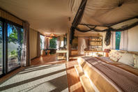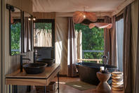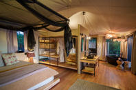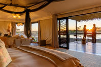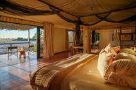 The camp consists of eight luxurious safari tents built on wooden platforms.Including one family tent, one honeymoon tent and six twins. Each tent has en-suite facilities and an additional outdoor shower for under the stars showering. A dining room, bar and lounge area are linked by raised walkways which provide superb views across the floodplains. The camp also offers a small swimming pool for a refreshing respite from the heat of the day.