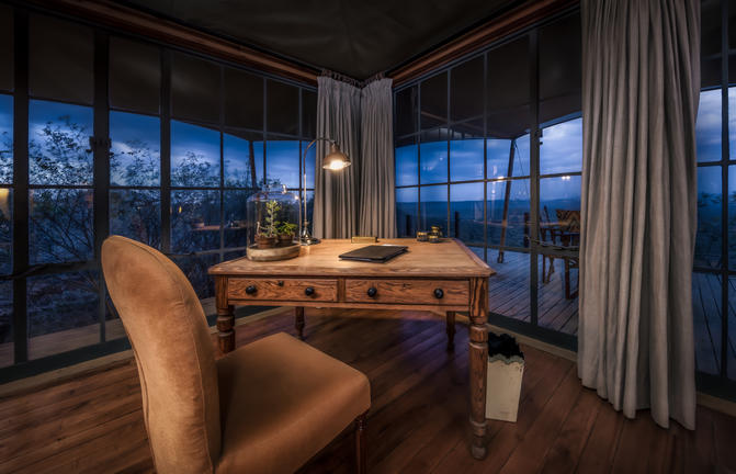 There is a comfortable lounge area with inviting chairs and writing desk. Bathrooms are luxurious with solar-heated hot water cascading from a rainfall shower to deliver a revitalizing cleanse after an action-packed day along with double-basin vanity and flush toilets. Curl up with a book or relax and take in the view of Loisaba from one of the plush double sunbeds located on the outside veranda.