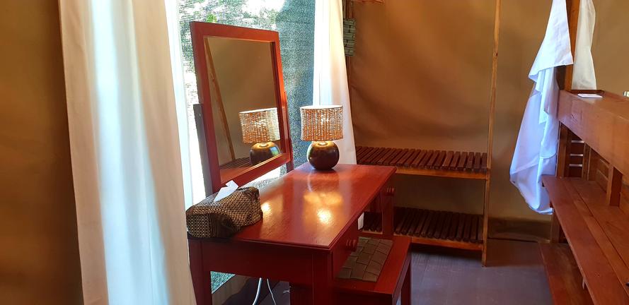 There are three “Classic” en-suite safari tents available which are Meru style tents, three windows long with ensuite bathrooms with semi-open shower, toilet and basin. The Classic tents are smaller than the Luxury tents and are even better value. They work well for single travellers or guests who are on a tighter budget. Two of the three classic tents are on the river bank, the other looks directly onto the same water hole as tent 11 (the honeymoon tent) and has more privacy. The classic tents have full beds (one king or two singles), large mosquito nets, Universal charging points and stand up electric fans. The standard tents do not have tea and coffee making facilities or safes and have smaller verandahs than the luxury tents.