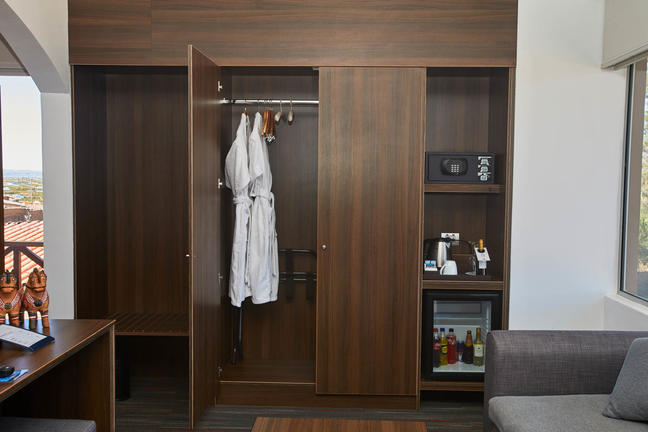The Family Suite has 1 queen size bed + 2 single bes in the mezzanine, living room, minibar, private Bathroom and Terrace
