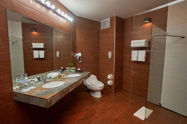 Amenities include Andean slippers crafted from recycled materials, robes, safety box, iPod speakers, a complete set of environmentally friendly toiletries, and a complimentary bottle of Pisco.
