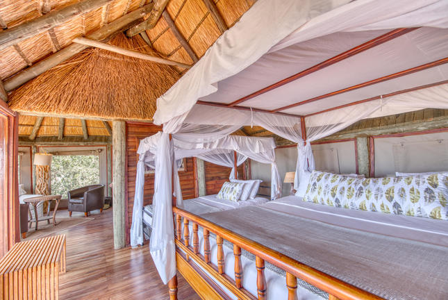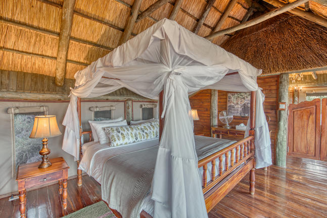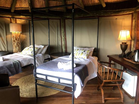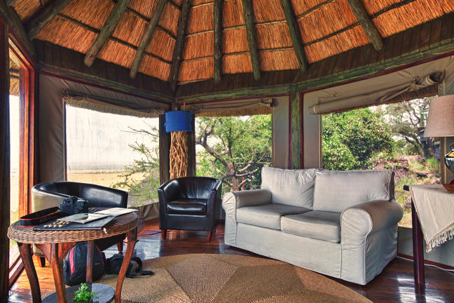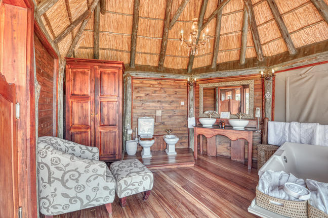 Twenty-five magnificent thatched safari rooms, complete with hardwood floors and baths, are tucked away amongst the acacia trees. Golf-cart escorts accompany guests from the main deck to their safari rooms. Each safari room boasts a private uninterrupted view of the Musabi plains, appreciable from the personal balcony or additional outdoor shower.