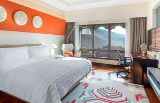 V našem luxusním hotelu Paro má každý dvoulůžkový pokoj výhled na borové lesy obklopující letovisko a stěny zdobí tradiční ručně malované bhútánské vzory.