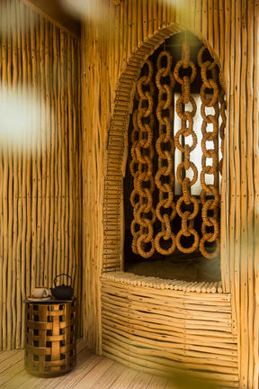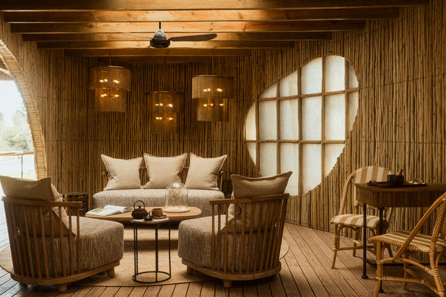 The accommodation is a sculptural marvel of natural and recycled materials.