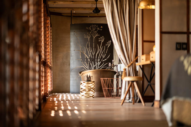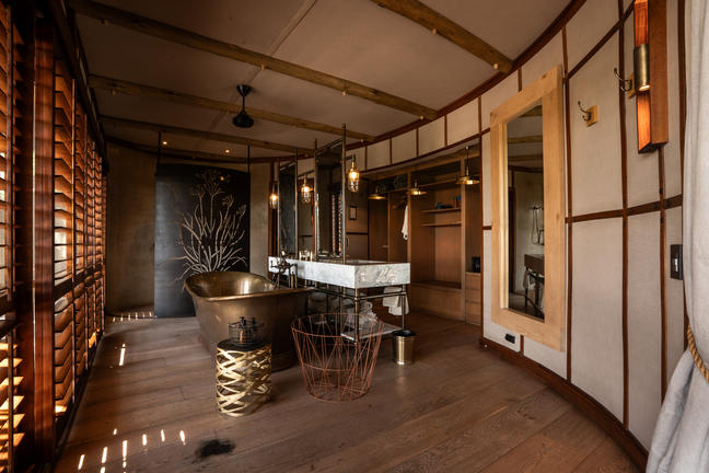 Perched on a large, suspended deck on a cliff overlooking the Zambezi River, the Bird House is an intimate and secluded retreat that celebrates the romance of the wilderness. The Bird House features a king size four poster bed, draped in mosquito netting and has an exquisite bird themed headboard, designed by Lightfoot Zambia. There is a small indoor lounge, with wooden and glass folding doors opening onto a private terrace and plunge pool. Unwind outdoors beside the river from the claw-footed, open-air bathtub covered in bubbles and with a cool, tall drink in hand as the sun sets over the Zambezi. Dine privately by the warm glow of lanterns, before sitting back to stargaze under the constellations of the Southern Hemisphere.