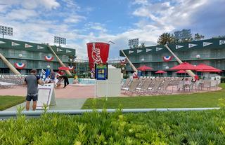 Les bâtiments sont décorés à grande échelle avec des objets sportifs géants (battes de baseball, ballons, sifflets, filets de tennis…) pour une ambiance immersive et très Disney.