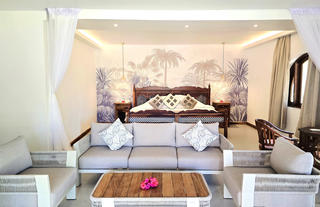 King size double/twin bed, a mosquito net, a mini bar, coffee station, flat screen TV/satellite channels, intercom, international telephone line, internet connection, hair dryer, digital safe, walk through shower, free standing tub and private toilet.