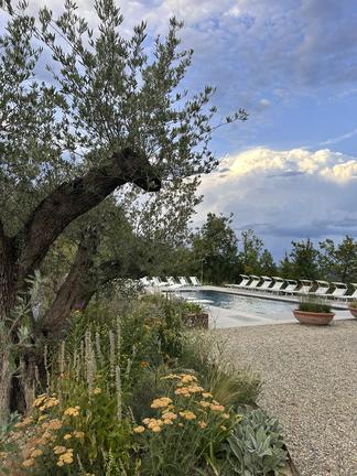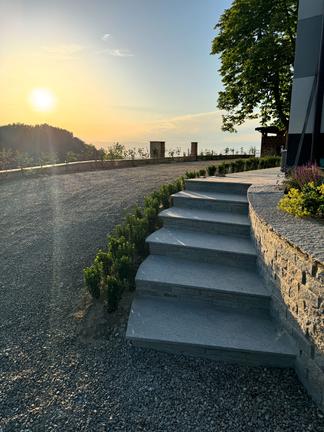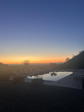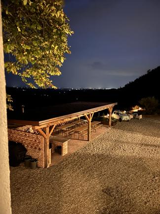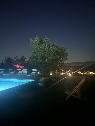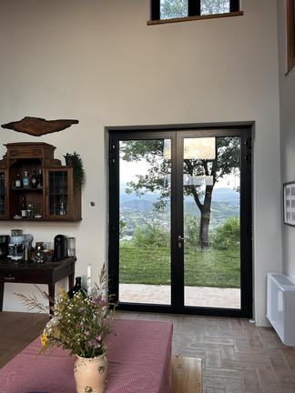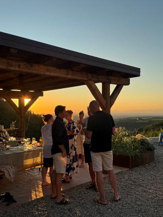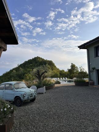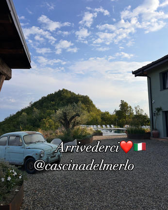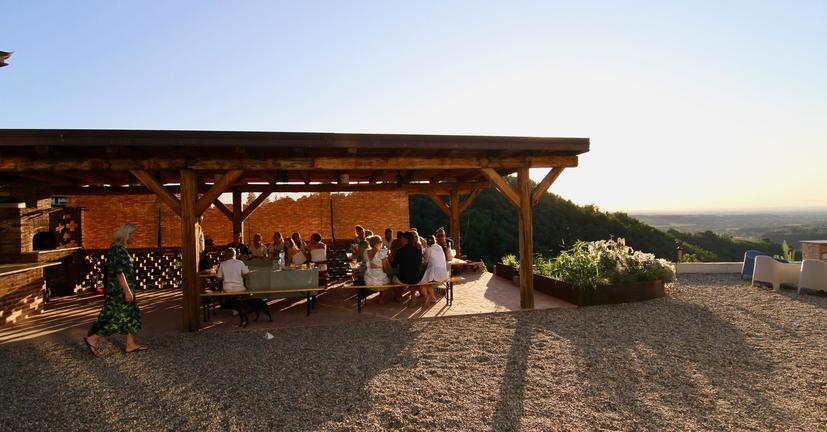 Cascina Del Merlo, beliggende på en solrik bakketopp helt for seg selv, med strålende utsikt over den sjarmerende byen Gavi (ca. 2,5 km unna) og byens fort. I det fjerne kan alpene skimtes. Her får du med deg både soloppgang og solnedgang!