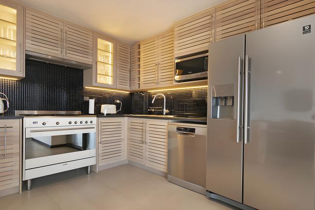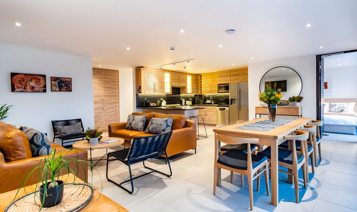 A private, sunny room with sliding doors onto a private garden, offers self-catering facilities. En-suite bath, shower and double basins. King size bed in the main bedroom. Air-cons.