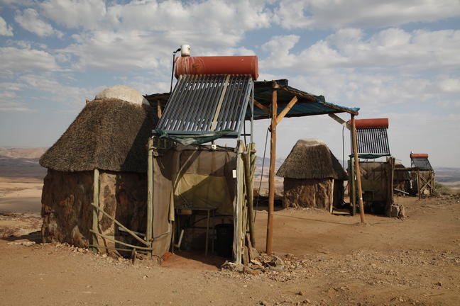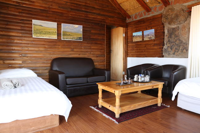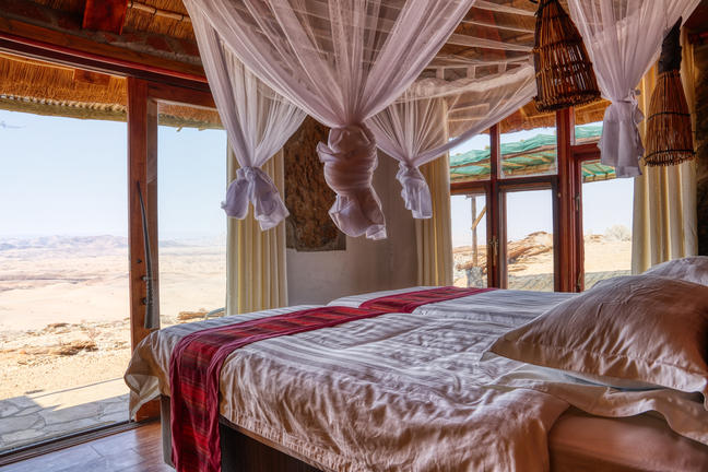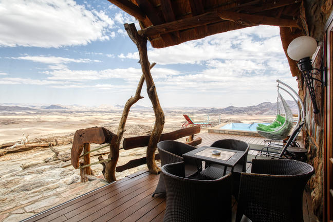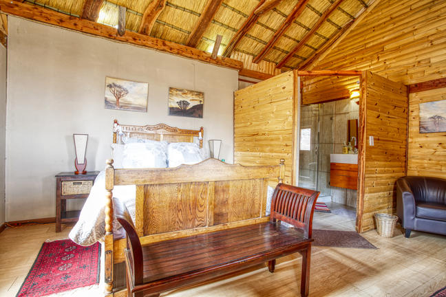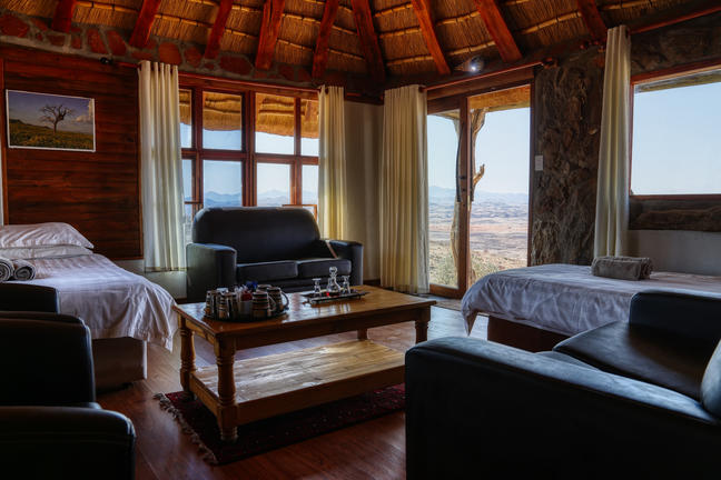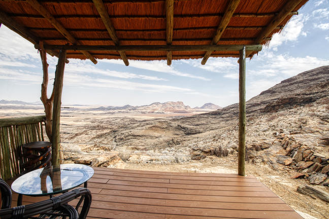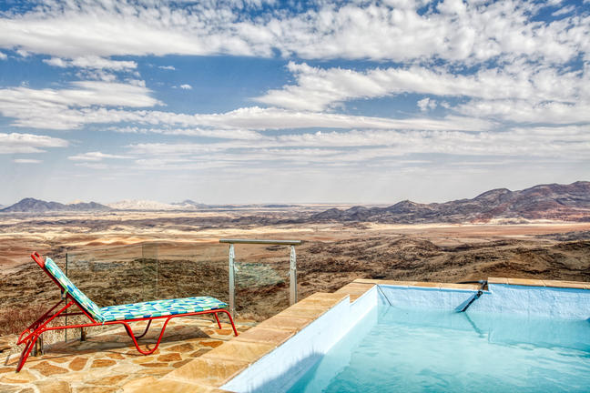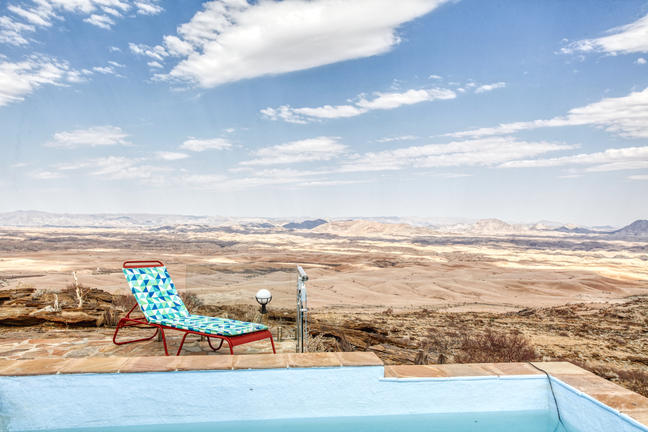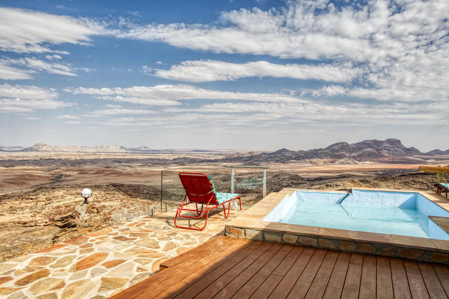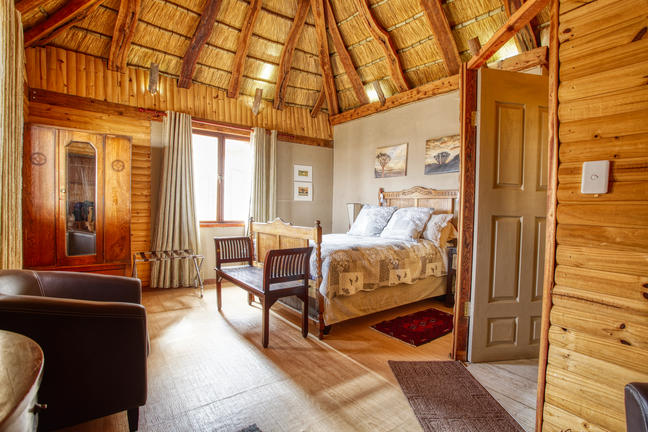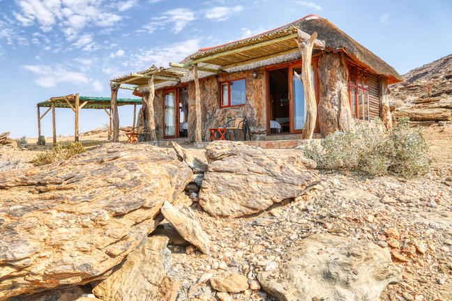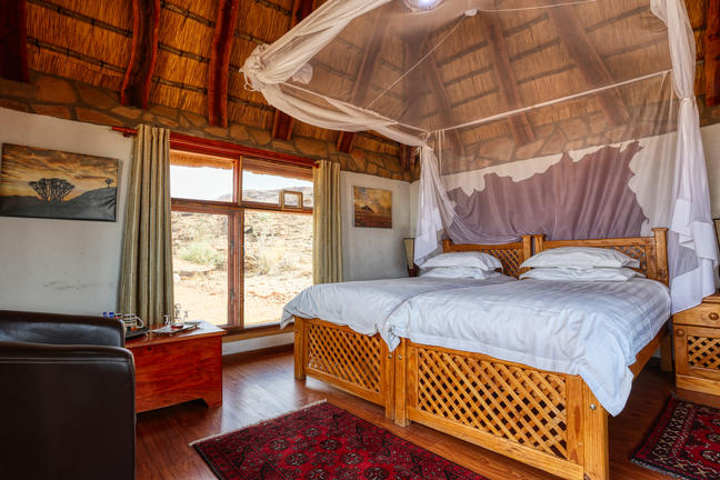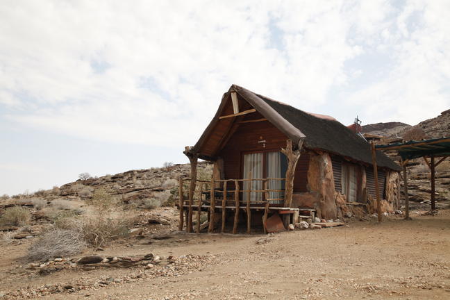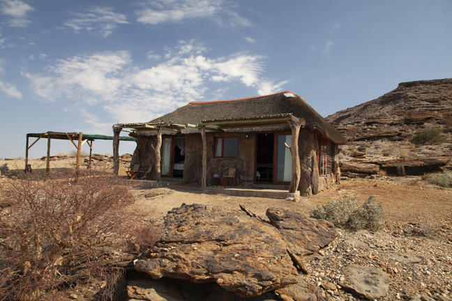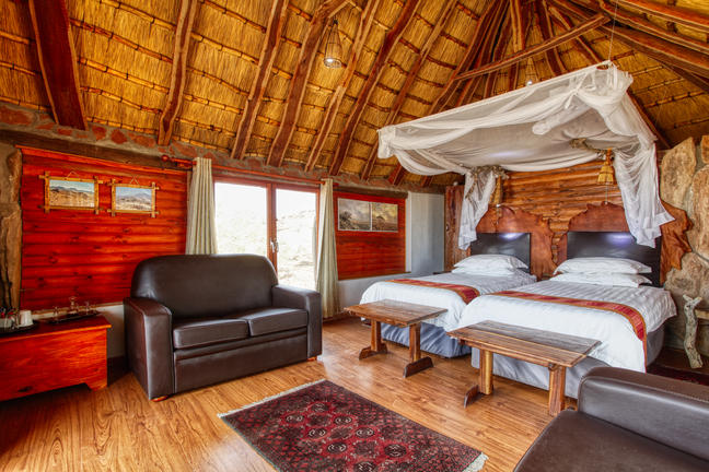 The wide valley in which the lodge is situated is sheltered by the Nubib, Tsaris and Naukluft Mountains, with a view reaching the distant dunes of the Namib Desert in the west. In this exquisite position, the lodge offers stylish accommodation in thatched chalets designed with the fragile beauty of this remarkable environment in mind. Desert Homestead Lodge will ensure an unrivaled respite from the desert extremes. Tranquil surroundings, al fresco dining, delectably fresh farm cuisine, refreshing dips in the two pools, stunning sunsets and sunrises are the basic pleasures at the lodge. And meandering across endless plains or discovering ancient water courses on a beautifully groomed steed is a magical and alternative way to appreciate the surroundings. The final remnants of each day see nature at her most profound. Rugged landscapes bathed in hues of pastel ... a truly humbling experience.