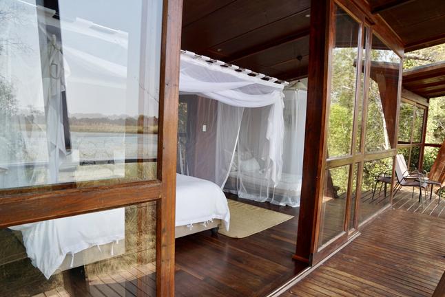 Superbement aménagées suites luxueuses de 110 mètres carrés. Chaque suite comprend une terrasse privée avec vue panoramique spacieuse, un salon privé, un lit double et une salle de bains privative. Bain et douche, coffre-fort personnel pour ordinateur portable, moustiquaire autour du lit, prises électriques pour recharger l'électronique, sherry gratuit, passerelles surélevées vers le lodge principal et service de blanchisserie.