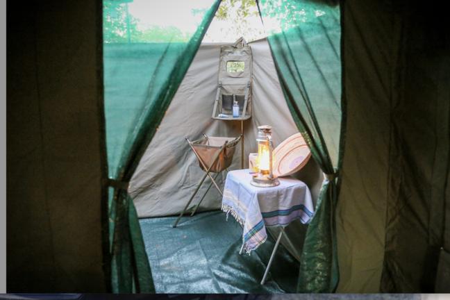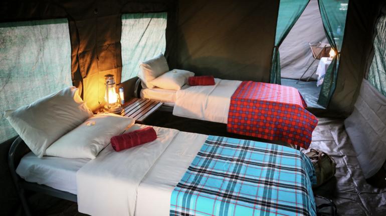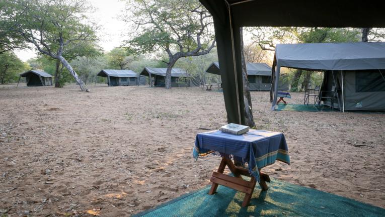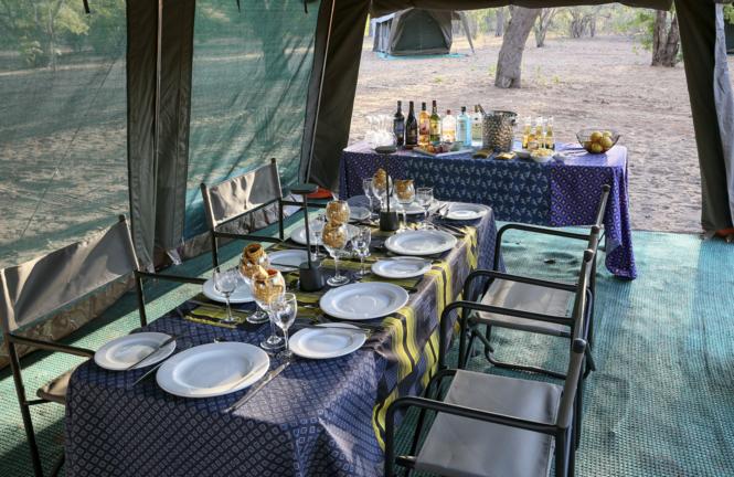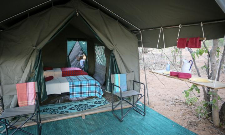 The camp features spacious en-suite tents with comfortable bedding, hot bucket showers, and shaded dining and lounge areas.
