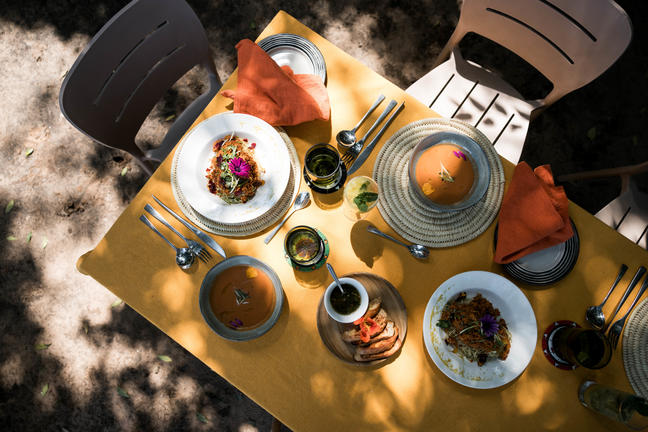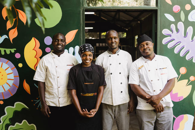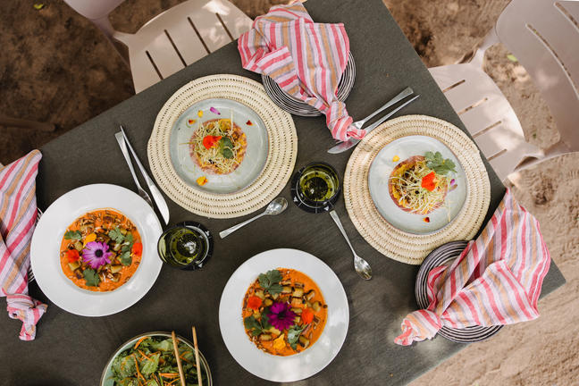 Emboo's culinary team prepares meals with produce from the camp's vertical and hydroponic gardens, located 100 steps from the kitchen. The menu blends Kenyan flavours with global influences, using fresh ingredients picked the same day they're served.