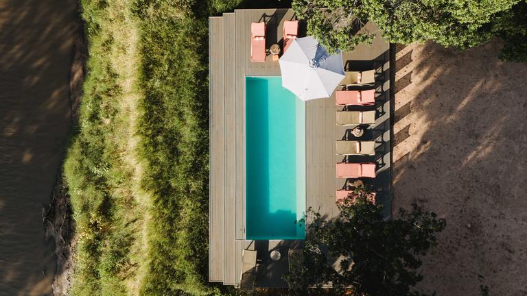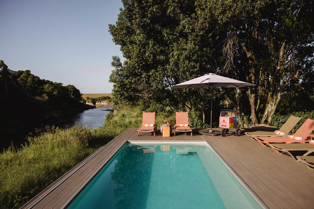 The swimming pool overlooks the Talek River, providing a place to cool down and relax during the midday heat. It's a practical addition that fits the rhythm of safari: early morning game drives, afternoons at the pool, and back out in the late afternoon for more wildlife.