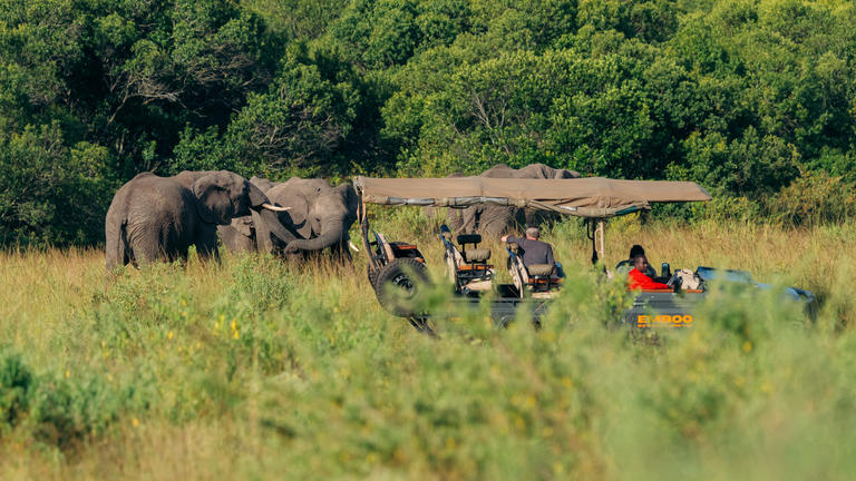 Emboo's game drives run in fully electric Land Rovers and Land Cruisers, powered by the camp's solar array. The vehicles are silent, which changes the experience: you hear the landscape, spot wildlife without engine noise, and get closer to the action without disturbing it.