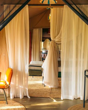 Emboo's Family Tent comprises two separate bedrooms, each available as either double or twin configuration, with its own en-suite bathroom. The layout provides space and privacy for families travelling together, with wardrobes, writing desks, and drinks stations in each room, and a shared entrance connecting the two bedrooms.