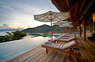 Three sumptuous bedrooms, each with a private bathroom opening out to tropical gardens, make the 520-square-metre retreats ideal for extended families or groups of friends. In a private hilltop position, surrounded by lush landscaping and served by a butler, each villa has a heated swimming pool and a separate pitched-roof living and dining pavilion.