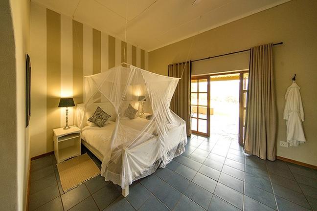 Il lodge può ospitare 48 ospiti in lussuosi chalet decorati in modo tale da potervi sentire come se foste un imperatore africano in una vita precedente. Ci sono 4 chalet familiari, ognuno per 4 persone (possono essere organizzati letti supplementari) e 14 chalet con letti singoli o matrimoniali. Gli chalet sono tutti en-suite, dotati di bagno, doccia, WC e lavabo. Sono forniti prese Square 13A 220V.