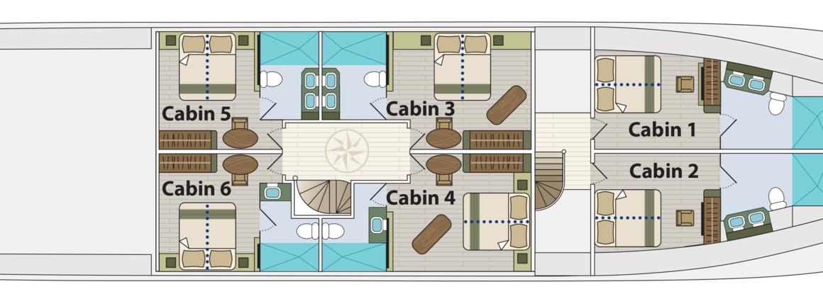 The size of the cabins are 170 ft² / 15.75 m² with porthole windows. The rooms are equipped with two twin beds convertible into one matrimonial bed, TV and DVD in the room, private bathroom, hot water & air-conditioning.