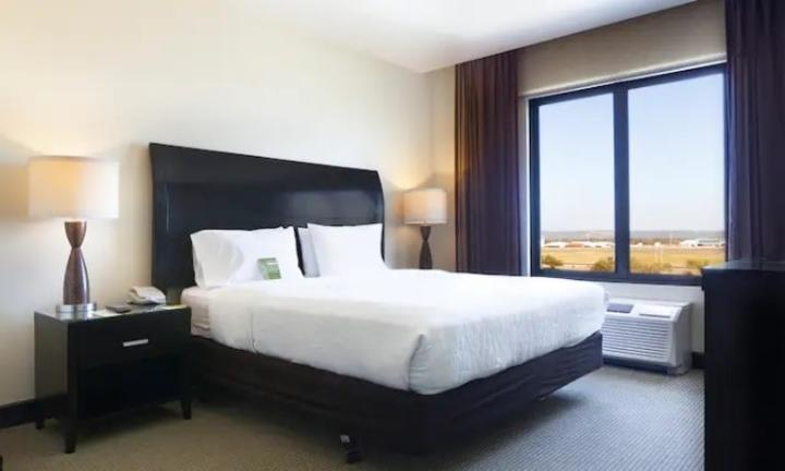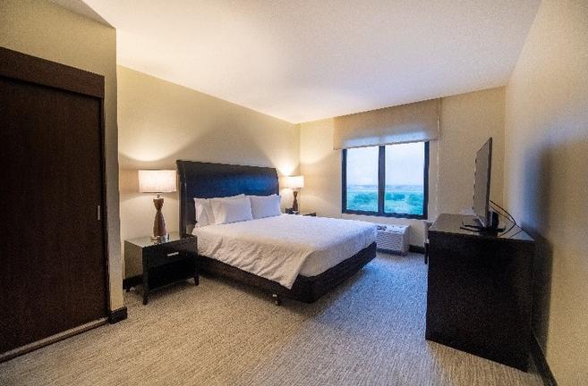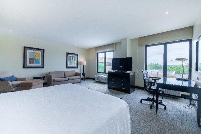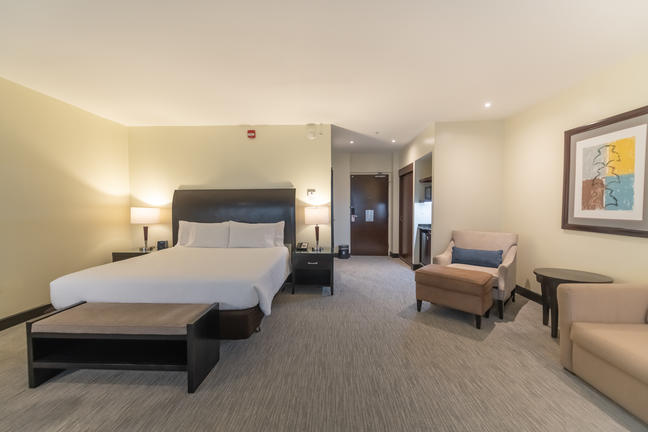 Get a comfortable night's rest in our one bedded evolution room featuring a plush king-sized Serta Suite Dreams bed with adjustable settings, hypo-allergenic pillows, and freshly laundered linens. Relax while watching your favorite shows on the 32-inch flat-screen HDTV with over 70 premium channels or unwind to your favorite tunes with our alarm clock/MP3 player. Sitting area complete with an ottoman and a hospitality center furnished with a microwave, mini-refrigerator, and a coffeemaker. Our oversized work area features an ergonomic desk chair, two telephones with data ports and voice mail, desk-level electrical outlets, complimentary WiFi access and adjustable lamp lighting to help ensure productivity. At the end of the day, refresh in the vanity area complete with granite countertops, roll-in shower and grab bars, complimentary signature bath products, hair dryer, and fluffy towels.