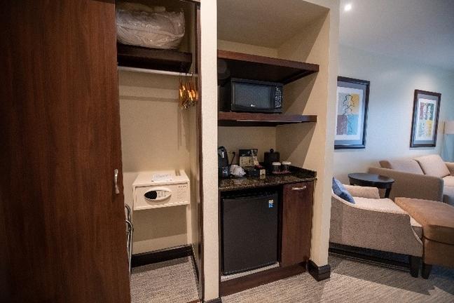 Enjoy the convenience of the microwave, refrigerator and a Keurig coffeemaker. Experience a comfortable night's sleep in the adjustable king-sized Serta Suite Dreams bed, offering the perfect balance between comfort and support.