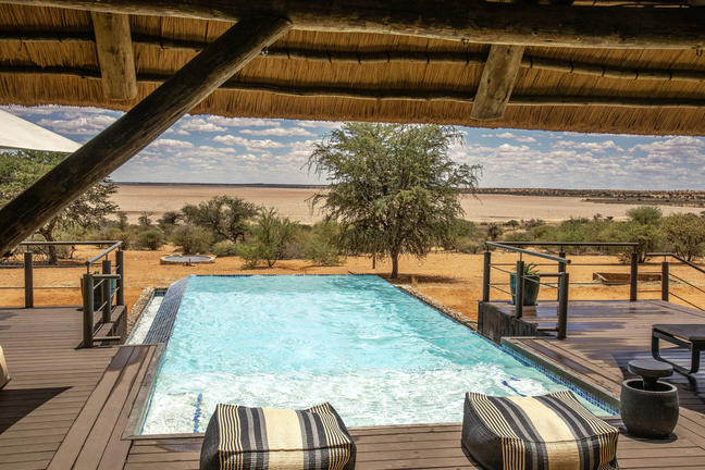 The lodge’s hallmarks are luxury and plenty of privacy. This remarkable place is superbly suited for safari excursions into Etosha. The main building is surrounded by large, ancient mopane trees in a wild, but park-like setting. Upon entering the lobby with the bar and spacious seating areas, the eye is drawn through the open building to the vast savannah, where often enough the first animals can be spotted right then. The large infinity pool also offers fantastic views of the open plain in front of the lodge and the two waterholes. The best spot to enjoy the sunset with a drink of your choice. After that we will treat you to a delicious 5-course dinner in our restaurant.