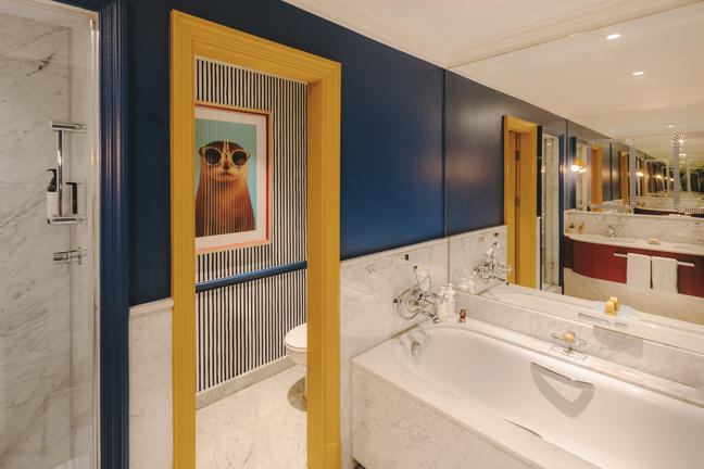 The spacious bedroom includes a king-sized bed, writing desk, complimentary Wi-Fi, satellite television, air conditioning, fixed luggage storage, bedside reading lights, a fully equipped tea & coffee station and a fully-stocked complimentary minibar.
