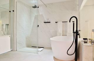 Das großzügige Badezimmer ist mit einer freistehenden Badewanne, einer riesigen ebenerdigen Dusche und zwei Waschbecken ausgestattet. Ein Kingsize-Bett und eine sonnige Leseecke runden die einladende Atmosphäre ab.