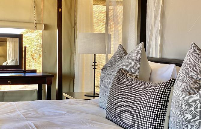 Les cabanes à 2 chambres ont été conçues pour les familles ou les petits groupes à l'esprit. Ils promettent un confort ultra-moderne tout en conservant l'authentique style namibien de design et d'architecture. Chaleur et force de la couleur, meubles originaux et décoration, chaque détail rappelle la richesse de la culture africaine. Un toit de chaume, fini à la main par des artisans locaux, complète parfaitement ces pièces au design circulaire traditionnel.