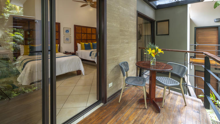 .Spacious and comfortable Standard Rooms at Arenal Observatory Lodge & Spa all feature two queen-sized beds, a private bathroom, a coffeemaker, a room safe, sitting chairs, and a writing table. Some Standard Rooms are located in the main hotel building and overlook the gorgeous Costa Rican rainforest or the impressive Arenal Volcano from their private balconies, while others are located 500 meters (0.3 miles) from the main hotel building, down a moderate slope, and feature terraces with striking views of Lake Arenal.