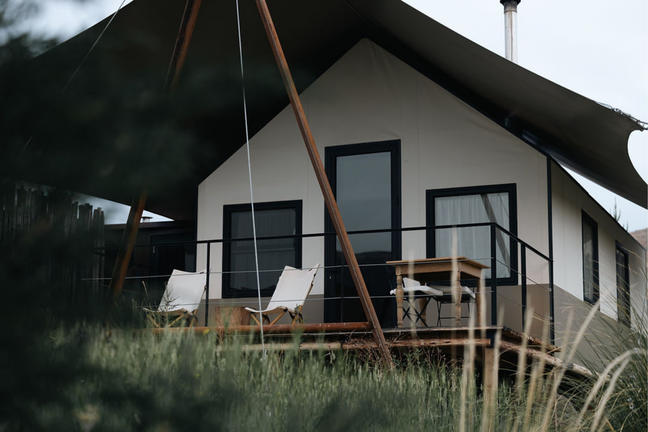 Canvas tents set the stage for exploration. This spacious stand-alone accommodation features an outdoor terrace with a sitting area, wood-burning stove, plunge pool, and indoor and outdoor showers. Furnished with a king-size bed or two twins, it also offers a reading area, while the exterior bathtub adds a touch of wilderness to your outdoor retreat. Experience nature with our canvas tent accommodations.