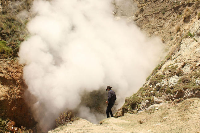 de mula —único medio capaz de abrirse paso hasta estas alturas sin camino— rumbo a un mundo volcánico donde géiseres humeantes,
