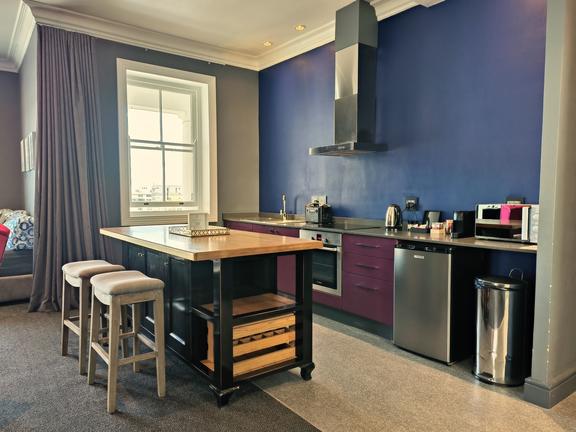 Top-floor luxury with a kitchenette, generous living area with cosy fireplace and private balcony boasting breathtaking views. Spacious and self-contained, it comfortably accommodates 2–3 guests—perfect for couples or small families seeking an unforgettable city escape.