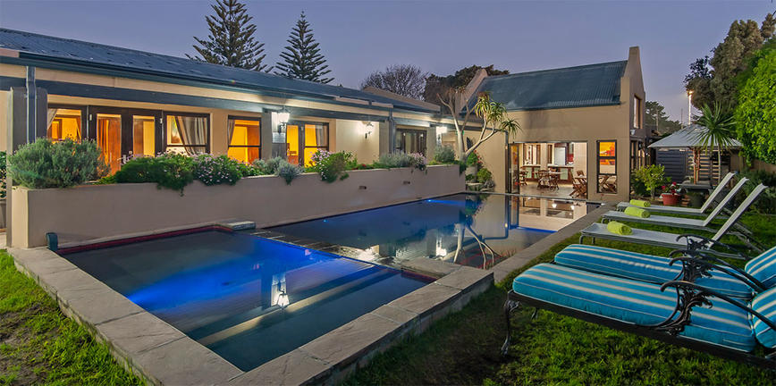 This 4 bedroom villa brings a slight avant-garde touch to seaside living as warm wooding furnishings stand out beautifully against modern kitchens and other contemporary touches such as brightly painted feature walls and wooden balustrades. The gardens exhibit their own swimming pool, braai and sheltered outdoor dining areas, easily melded with indoors simply by opening the broad sliding windows. Indigenous hedges surrounding the gardens and provide a natural barrier against wind. Those not fearsome of heights can climb the exterior ladder to a viewing deck on each roof. Twin rooms are located in the first floor of the villas while double rooms offer panoramic sea views from the top story. In addition there are two single garages and a guest bathroom located in the entrance hall.