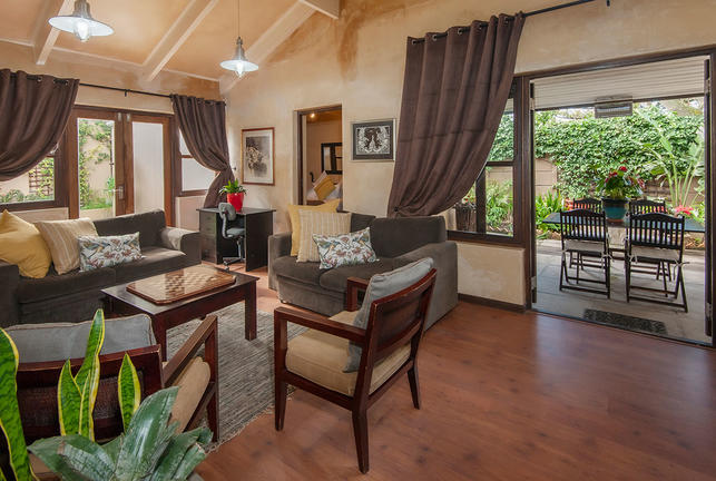 Each cottage is walking distance from the beach.Spacious open plan kitchen , lounge and dining area.Sliding door in living room leads to a shaded patio with a private garden and braai. 3 bathrooms. 2 double rooms and 1 twin bedroom.No sea view.All meals, including breakfast, available at our Joe Fish Restaurant.