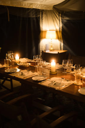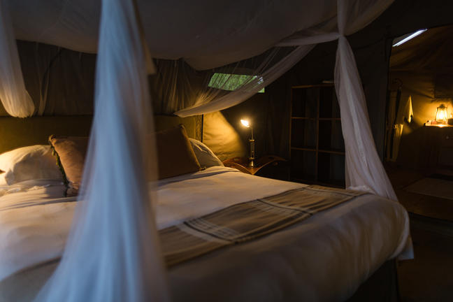 Our guests stay in golden-hued tents with gleaming hardwood floors. Staying under canvas is one of the most romantic and exciting things to do in on safari in Africa. You hear the sounds, you feel the wind, you smell the rain before it comes. But this isn’t roughing it either: the tents are protected by a thick thatch roof and feature en-suite bathrooms with running water, hot showers and flush toilets.