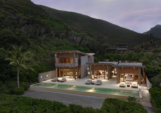 50 villas sit along a mile of sandy beach, sheltered by the green, forested hills behind and with stunning vistas of the deep blue sea and the curve of the bay.